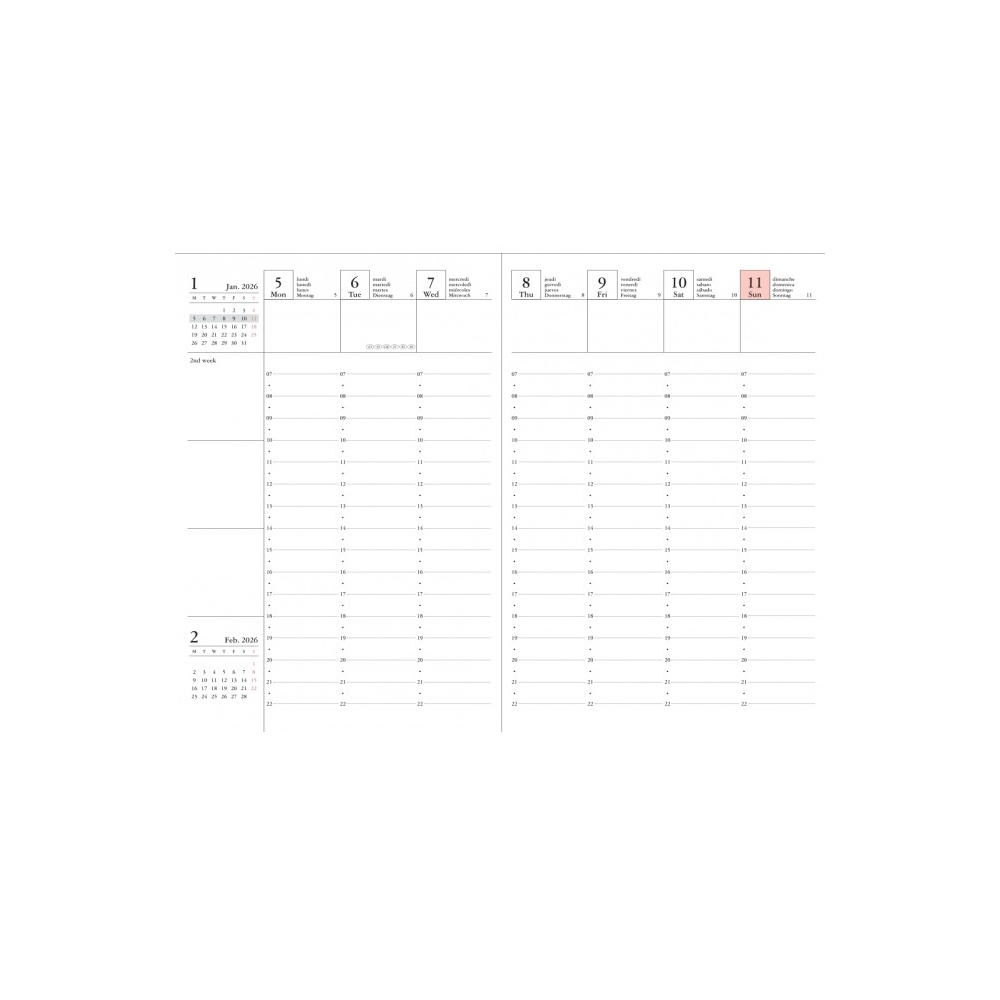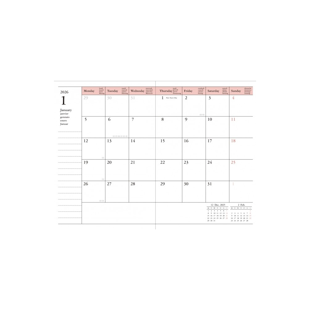 L'agenda 2026 Japan est disponible en grand format (A5), moyen format (B6) ou petit format (A6). Il est ultra pratique grâce à sa pochette zippée tactile, pour y glisser stylos, cartes de visites, smartphone... La semaine est sur deux pages pour faciliter les prises de rendez-vous. Il contient également un tableau récapitulatif de chaque mois et des pages de notes.