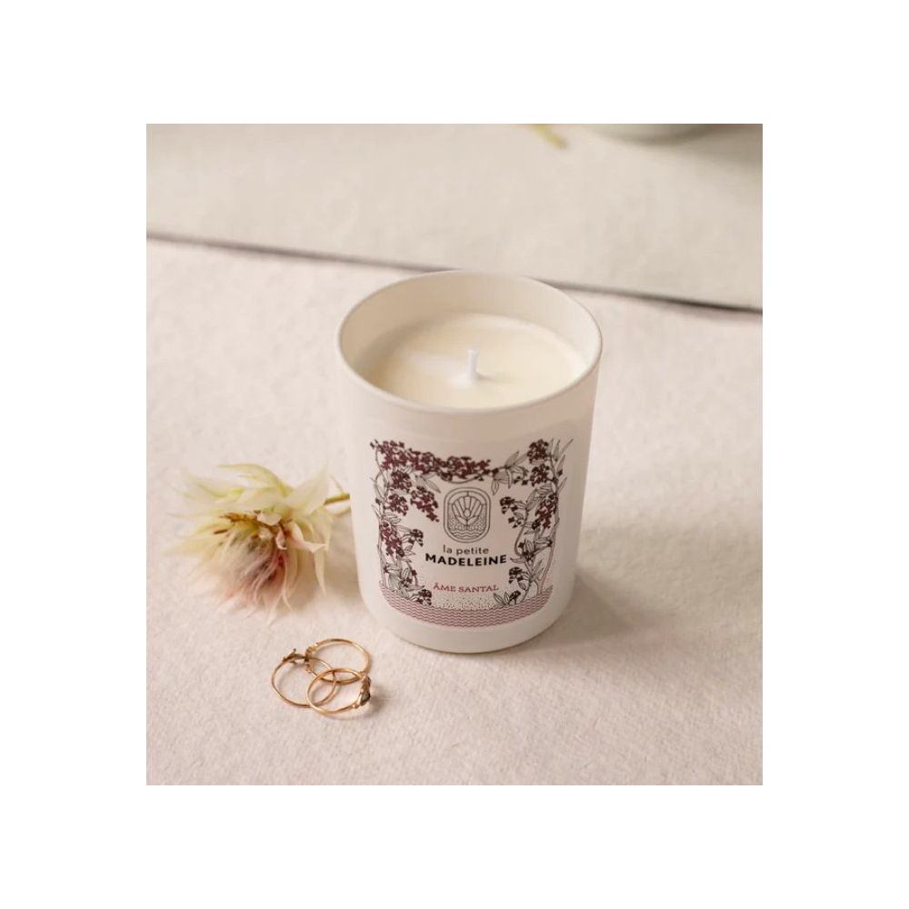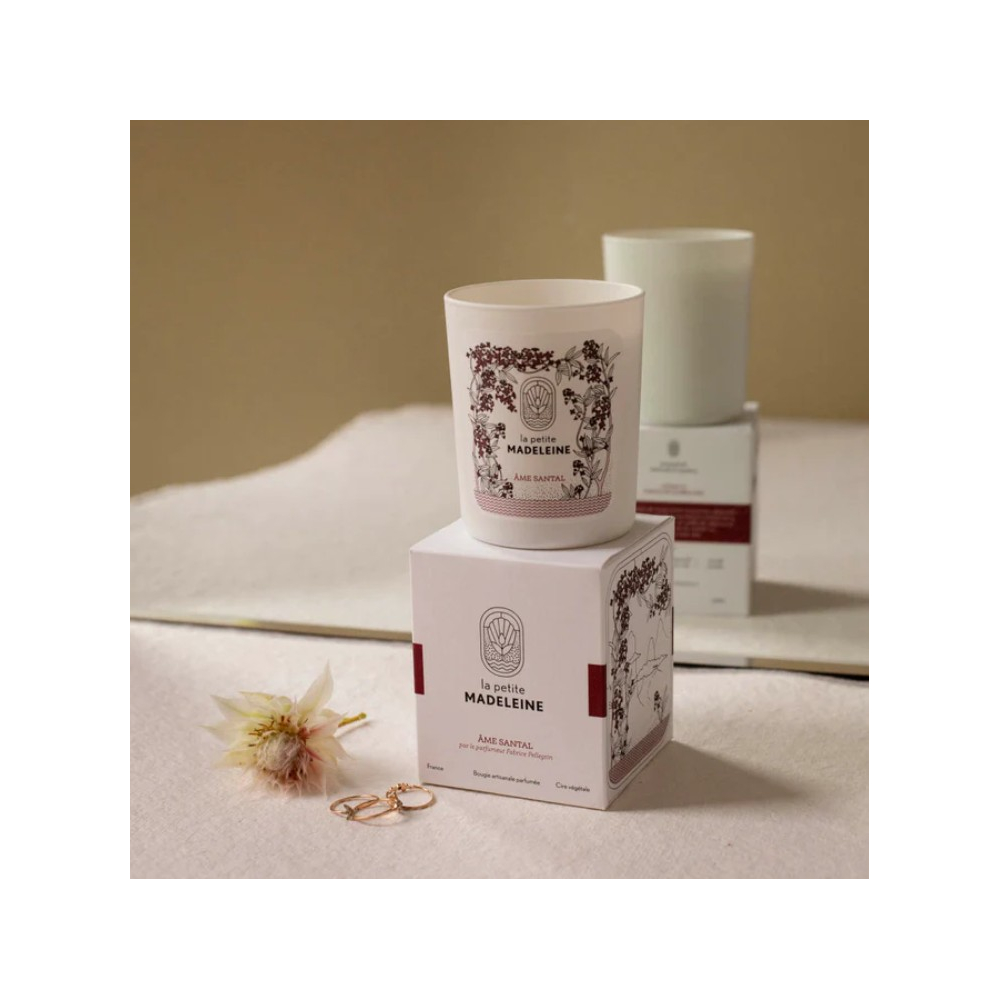 Cette bougie artisanale parfumée est fabriquée à partir de cire végétale au sein de l'atelier de "La Petite Madeleine" à Troyes.
