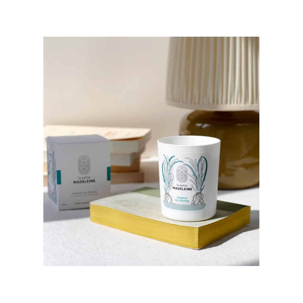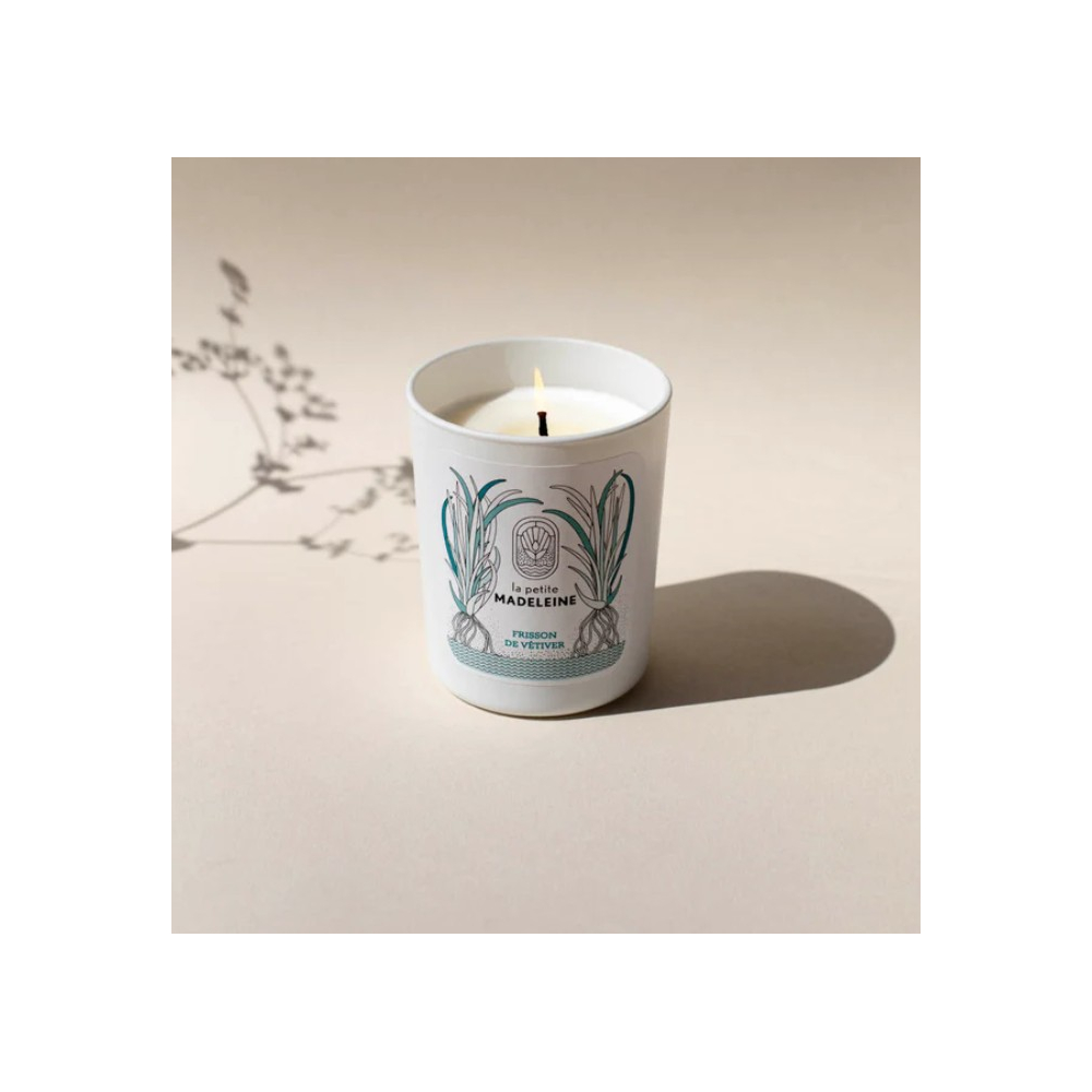 Cette bougie artisanale parfumée est fabriquée à partir de cire végétale au sein de l'atelier de "La Petite Madeleine" à Troyes.