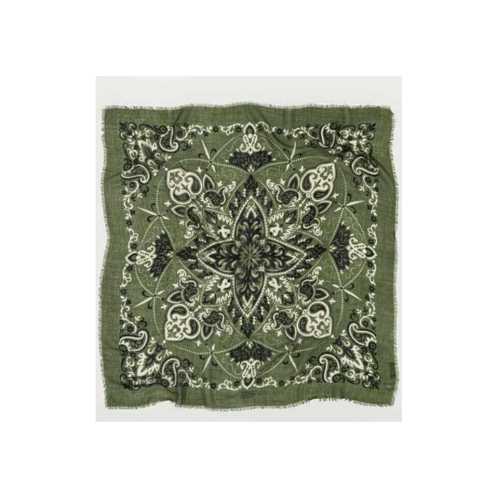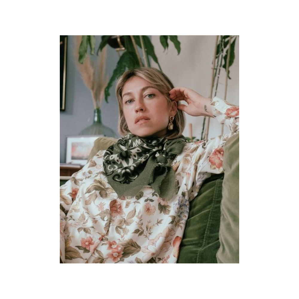 La combinaison de la laine douce et de la soie somptueuse crée un accessoire d'une élégance, alliant chaleur et sophistication dans une palette de kaki raffiné.