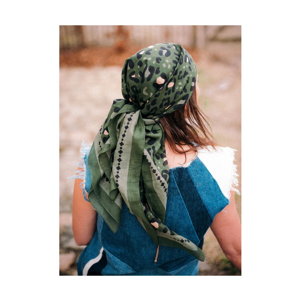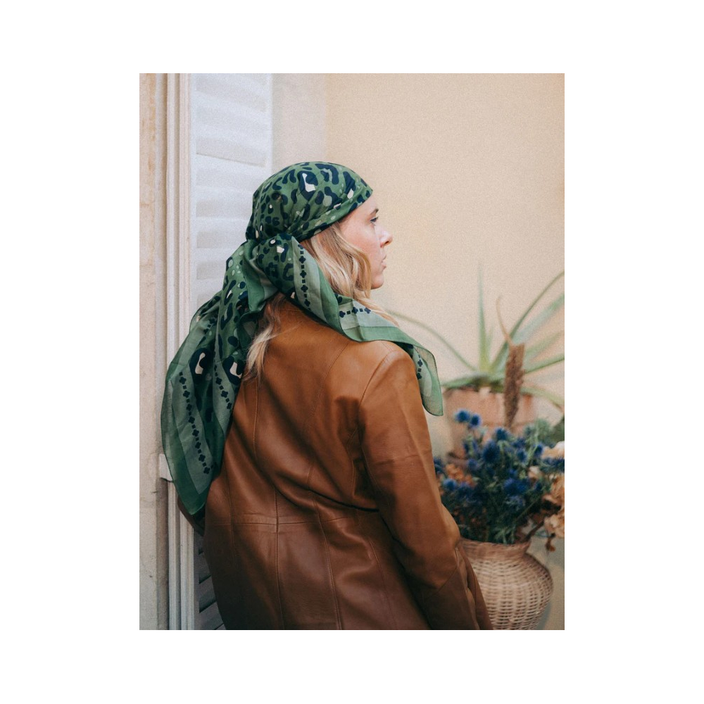 La teinte verte, chaude et polyvalente, associée à la légèreté du voile de coton, fait de ce foulard un accessoire incontournable pour rehausser votre style avec une touche délicate.
