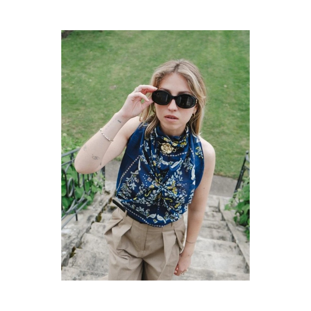 La teinte navy, polyvalente, associée à la légèreté du voile de coton, fait de ce foulard un accessoire incontournable pour rehausser votre style avec une touche délicate. Que ce soit pour une journée décontractée en ville ou une escapade estivale, ce motif Secret garden ciel devient l'expression parfaite de la décontraction chic.