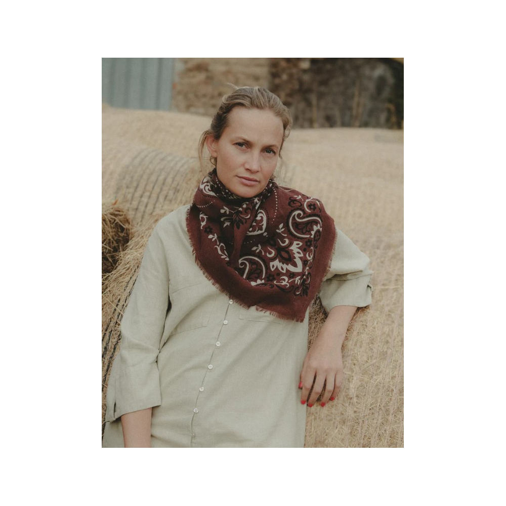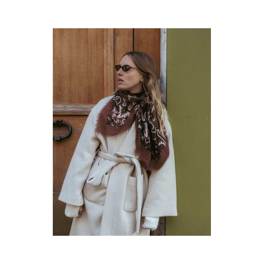 La combinaison de la laine douce et de la soie somptueuse crée un accessoire d'une élégance, alliant chaleur et sophistication dans une palette de chocolat raffiné.