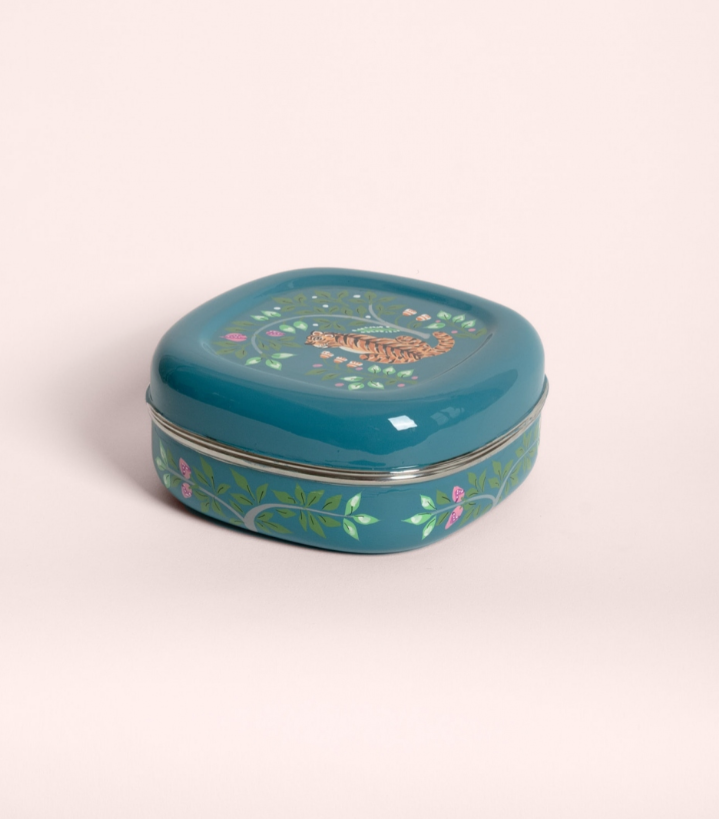 Cette boîte carrée Jamini est un écrin de vaisselle artisanale indienne en inox, peinte à la main par des maîtres du Cachemire. Elle se pare d’une riche palette de motifs fleuris et animaliers: arabesques luxuriantes, fleurs stylisées, éléphants majestueux, singes ou tigres du Bengale. Parfaite pour conserver épices ou bijoux, son couvercle s’emboîte en douceur pour protéger vos trésors.