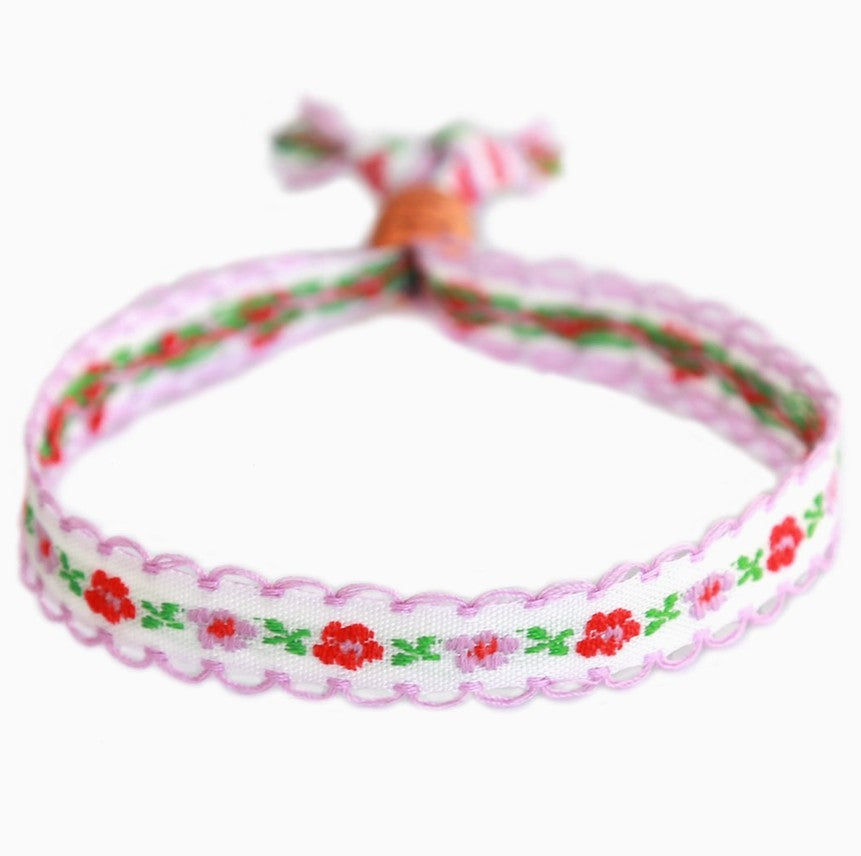Un joli bracelet tissé à l'imprimé floral. Facile à ajuster grâce à la perle coulissante.