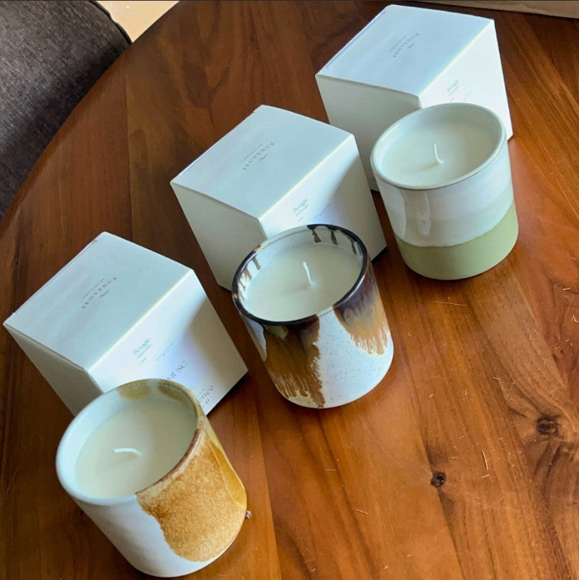 Cire 100% végétale, mèche en coton, parfum de Grasse et pot en céramique réutilisable.