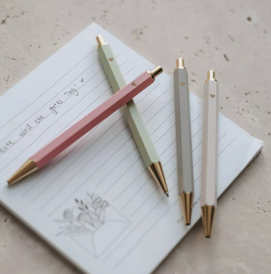 Ce stylo à bille est la touche déco parfaite pour votre bureau! Fabriqué en métal de haute qualité, il apporte de l'élégance à votre quotidien avec ses touches dorées, telles que la pointe, le bouton-poussoir et un petit cœur.